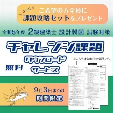 本年度の設計製図課題「専用住宅(木造)」を徹底分析し、制作した当学院オリジナル課題を無料でダウンロードできるサービスです。高い合格実績を誇る当学院のオリジナル課題を無料で入手できる貴重な機会です。