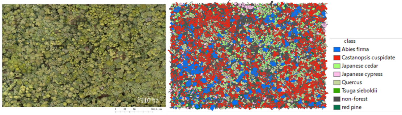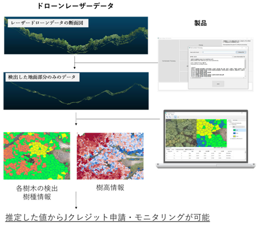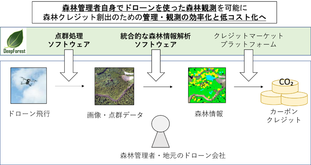 ドローンの画像データから森林の各樹木の検出・樹種の識別・樹高及び太さの推定・幹材積の計算・炭素蓄積量推定が可能なソフトウェア「DF Scanner」の開発・販売を行っております。