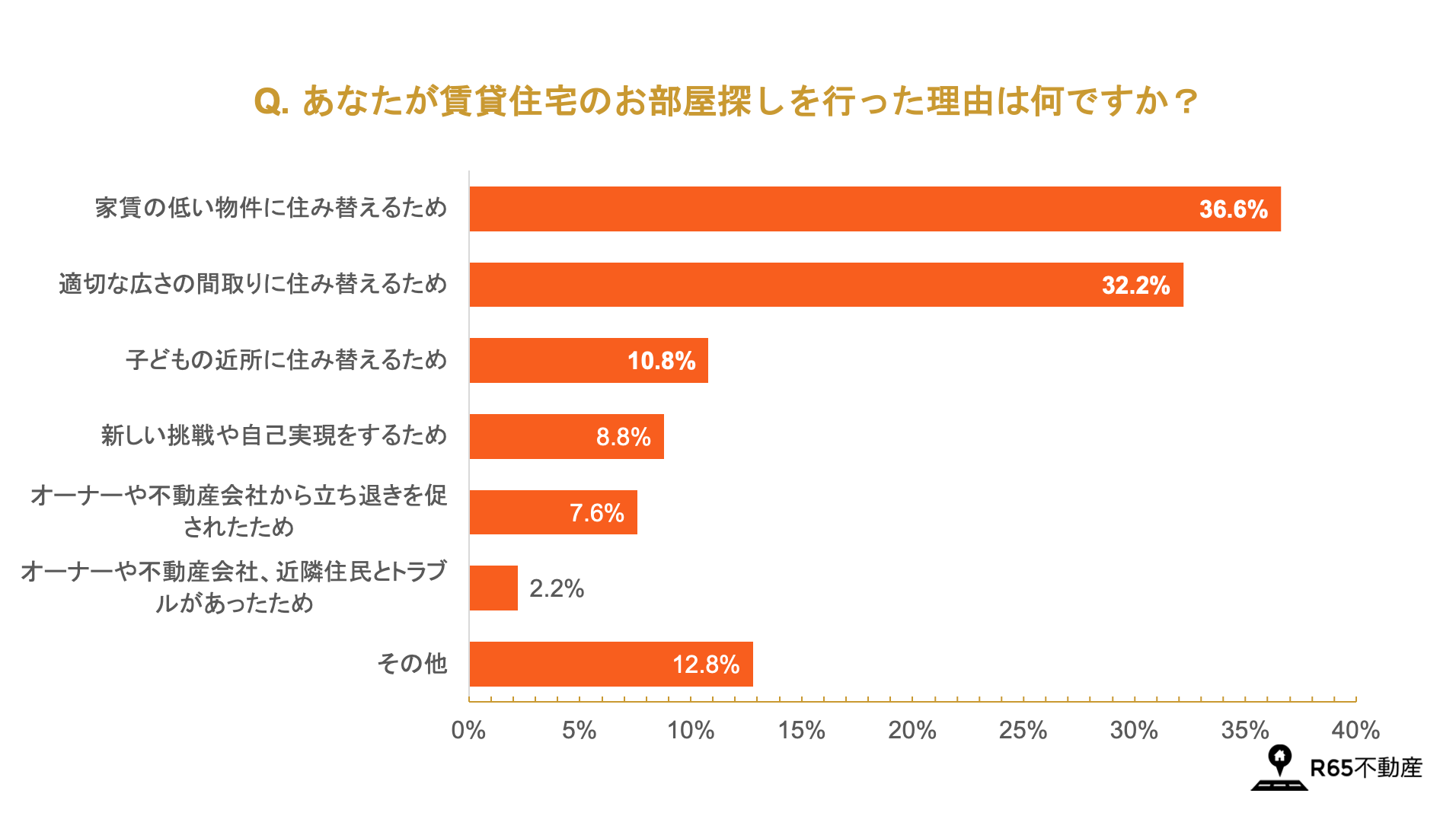 全体のうち、65歳を超えて賃貸住宅のお部屋探し経験のある高齢者は35.7%となりました。賃貸住宅への住み替え理由としては、「家賃の低い物件に住み替えるため(36.6%)」が最も多く、2位が「適切な広さの間取りに住み替えるため(32.2%)」、3位が「子どもの近所に住み替えるため(10.8%)」となりました。また、「オーナーや不動産会社から立ち退きを促されたため」と回答した方は7.6%となっています。