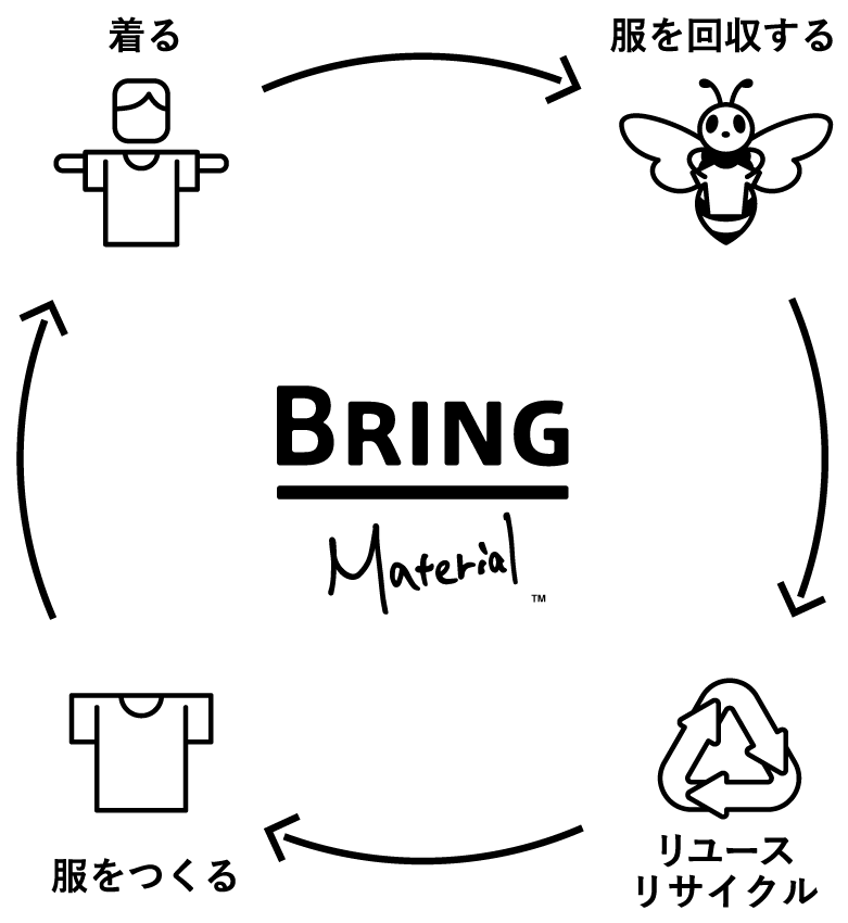 “ポリエステルをサステナブルに”をキーワードにするBRING Material は、不要になった衣類やアパレル 製品をつくる際に発生する繊維くずを原料に、独自のPETケミカルリサイクル技術「BRING Technology™」を用いて再⽣・製造された100%繊維由来の再⽣ポリエステル原料です。