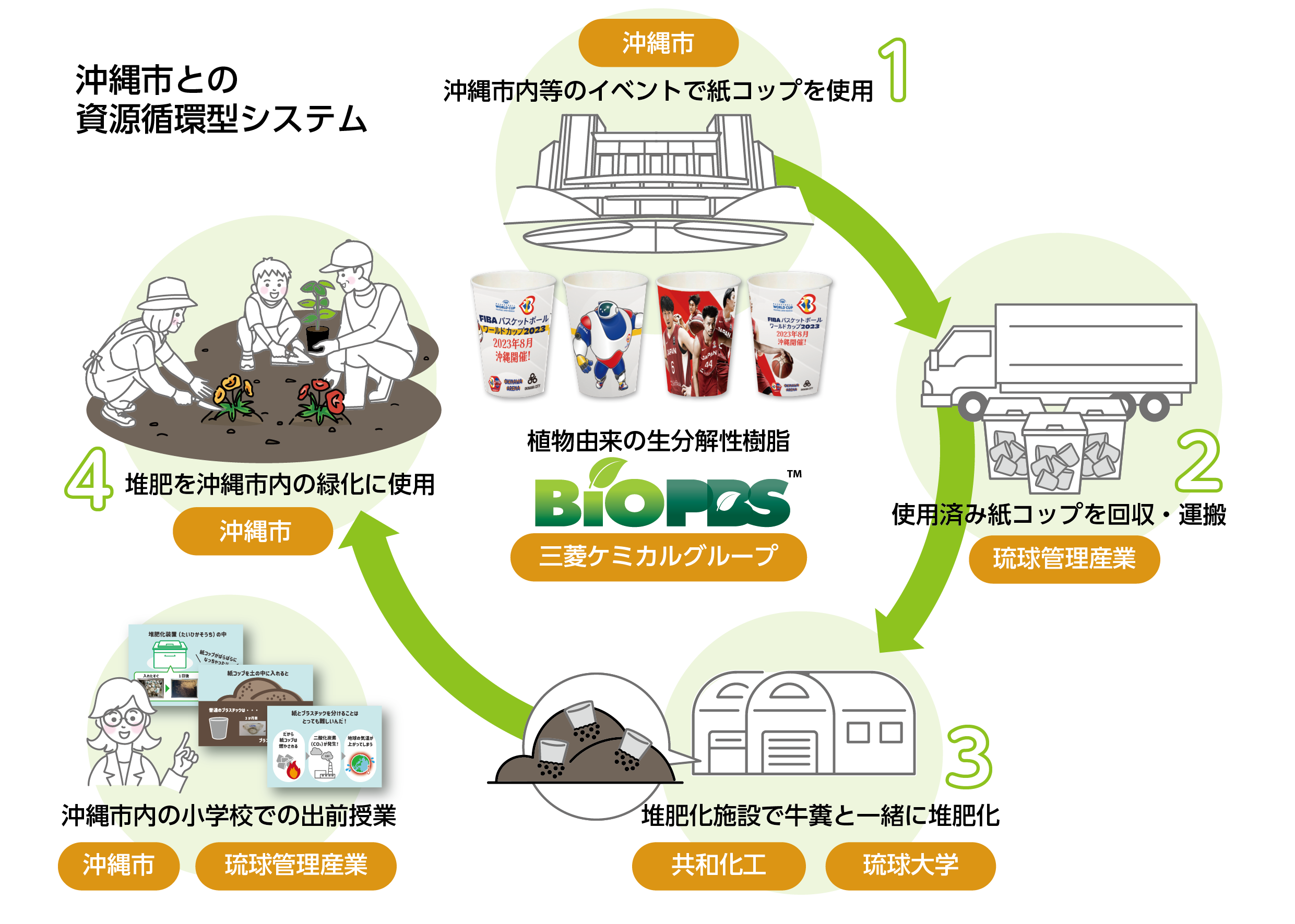 三菱ケミカルグループ※1(以下「当社グループ」)は、沖縄市と連携し、当社グループの植物由来の生分解性樹脂「BioPBS™」を使用した紙コップを起点とする資源循環型システムの実証実験を行うことをお知らせします。