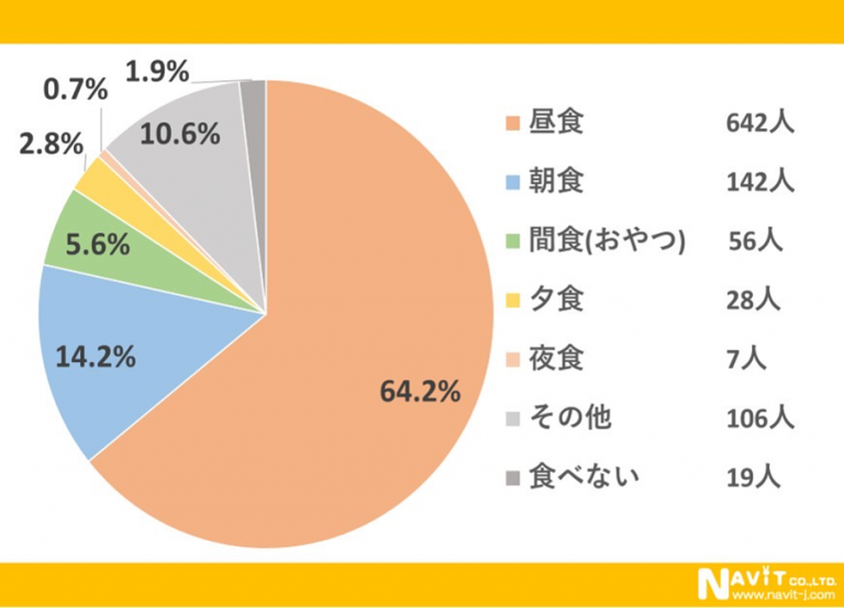 おにぎりは「昼食」に食べるという方が64.2%です。お昼休みなどに手早く食べるのでしょうか。次が「朝食」で14.2%です。「間食」が3番目で5.6%となっています。