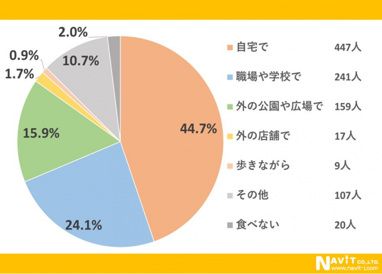 おにぎりは「自宅で」食べるという方が一番多く64.2%です。次に「職場や学校で」食べるという方が24.1%と続いています。3番目が「外の公園や広場で」という方が15.9%です。天気が良い日などは公園でおにぎりを食べるのも良いですね。