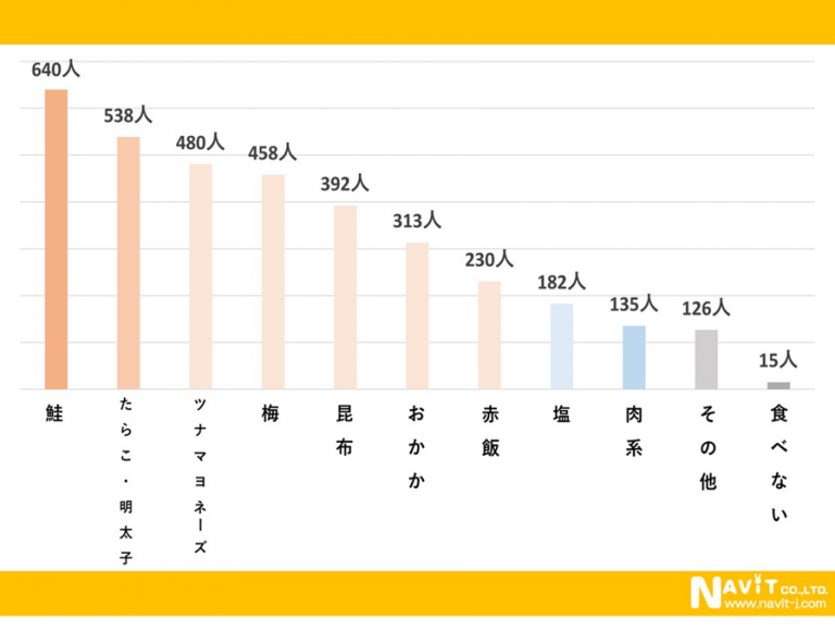 おにぎりの具で見事1位を獲得したのは「鮭」です。得票数は640人となっています。2番目以降も僅差で「たらこ・明太子」が538人、「ツナマヨネーズ」が480人となっています。