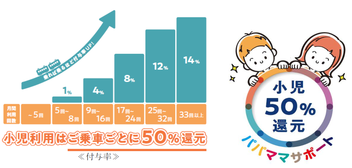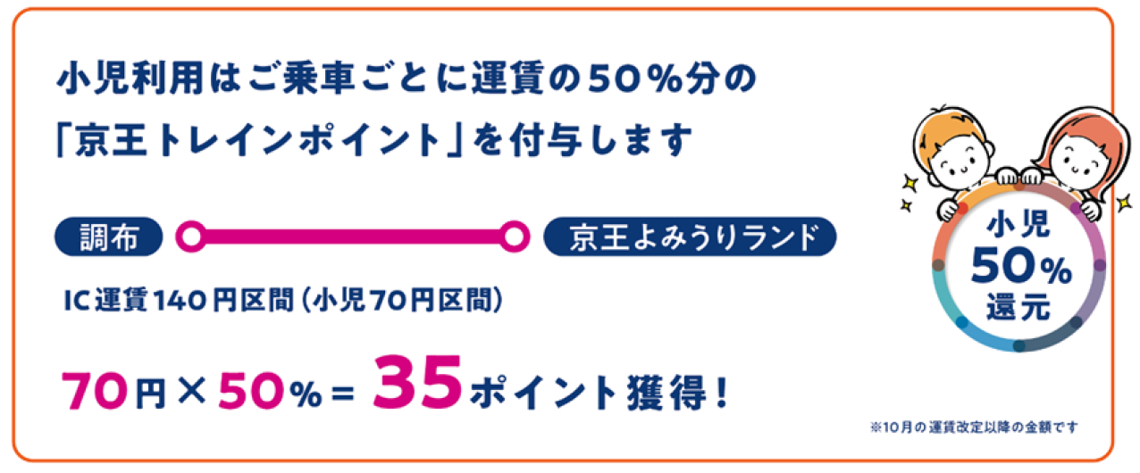 また、子育て世代のお出かけを応援するため、お子さまが小児運賃でご乗車する場合は、1回のご乗車ごとに当社線の乗車運賃の50%分の「京王トレインポイント」を付与します。お子さまが当社線をご乗車いただきやすい環境とすることで、子育てしやすい沿線を目指します。