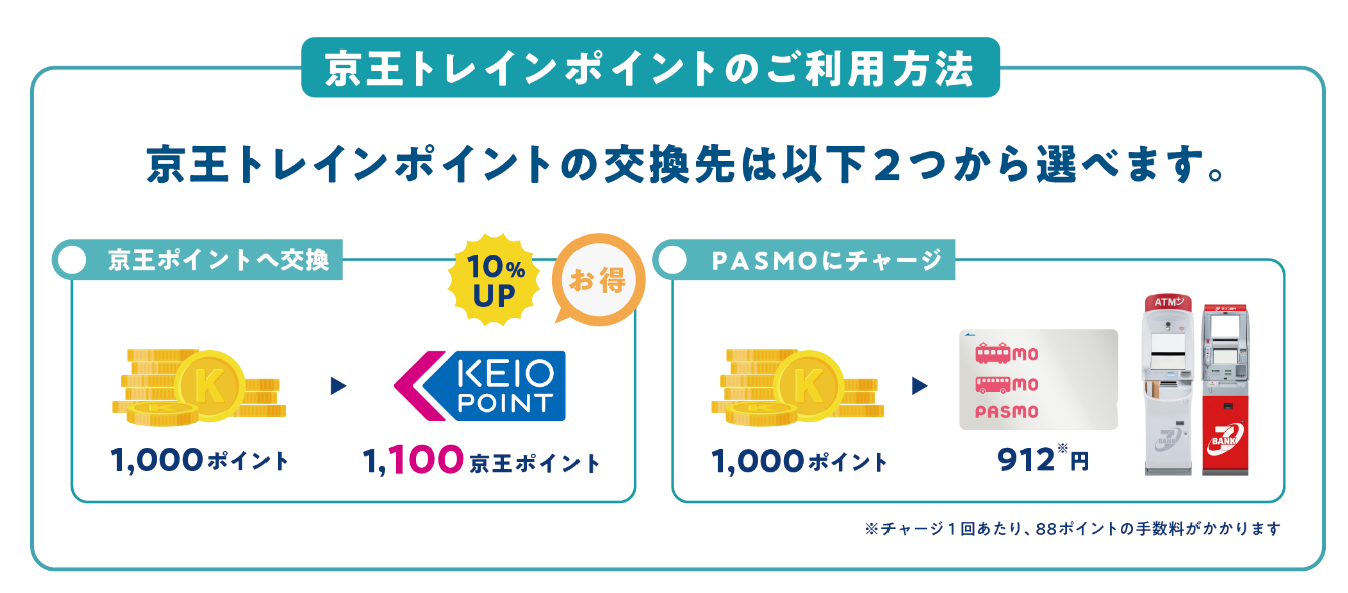 「京王トレインポイント」は、京王アプリ内の鉄道乗車ポイントサービス専用ページで「京王ポイントへ交換」、または「セブン銀行ATMでPASMOへチャージ」を選択して利用します。