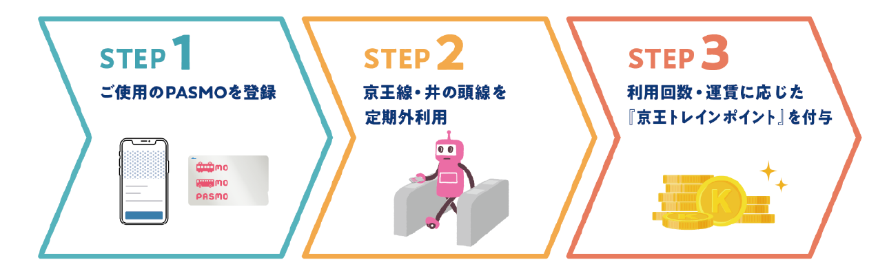 ※自動改札機で入出場し、会員登録したPASMOで当社線の定期外運賃をお支払いいただいたご乗車が対象となります。定期券区間内や企画乗車券でのご乗車は対象外です。大人の方は、毎月10日を目安に前月分のご乗車に対して「京王トレインポイント」が付与されます。小児の方は、ご乗車の3日後を目安に「京王トレインポイント」が付与されます。