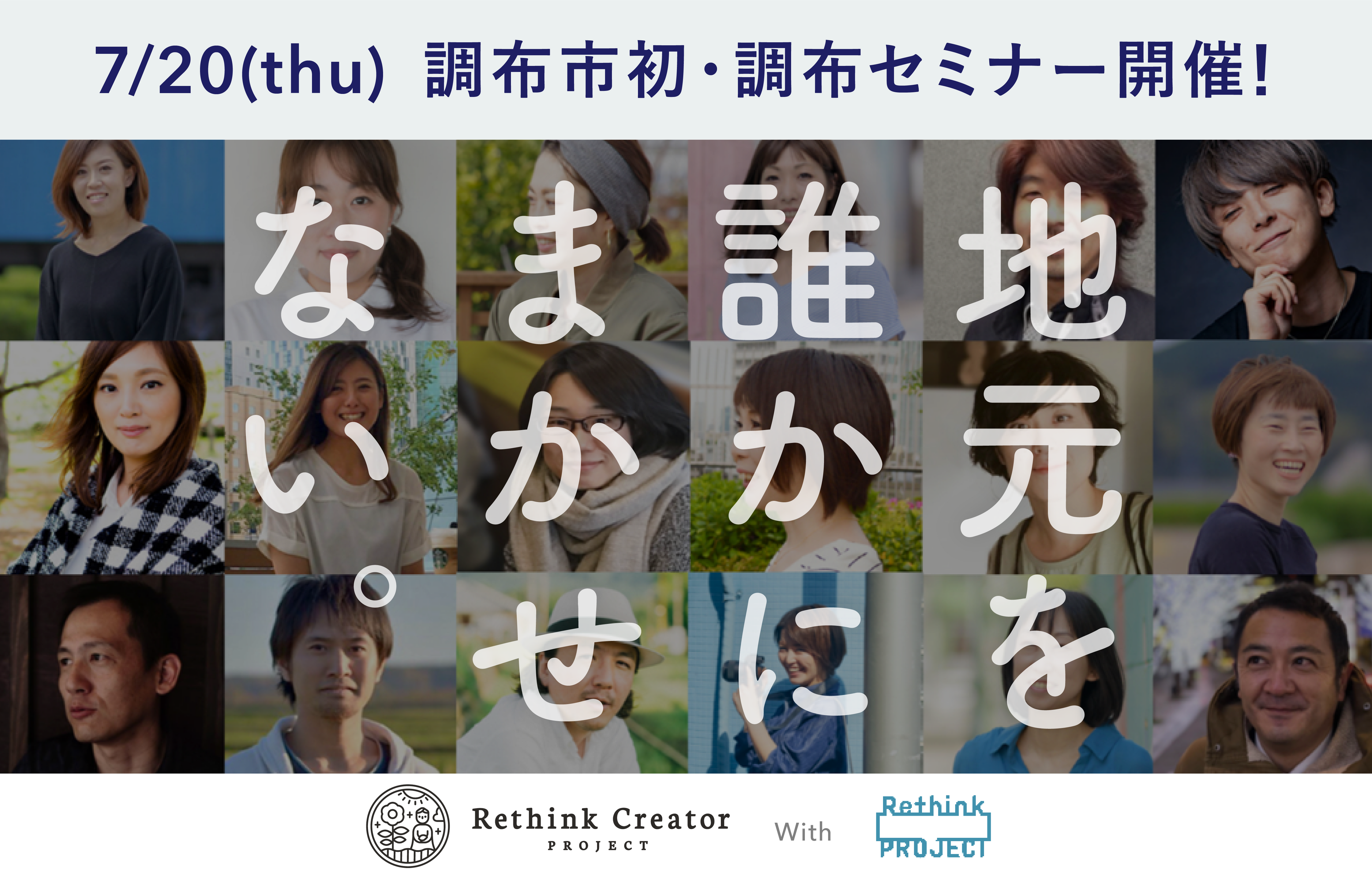調布セミナーは、『Rethink Creator PROJECT』が掲げる「クリエイターの地産・地消による地域創生の実現」というコンセプトに賛同いただいた調布市に後援いただき、クリエイターズマッチの運営、「Rethink PROJECT」の協力のもと調布市で初めて開催します。