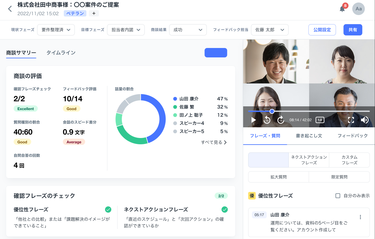 【2】商談内容を詳細に可視化。次回商談や受注につながる “優位性フレーズ“の有無を確認できる。