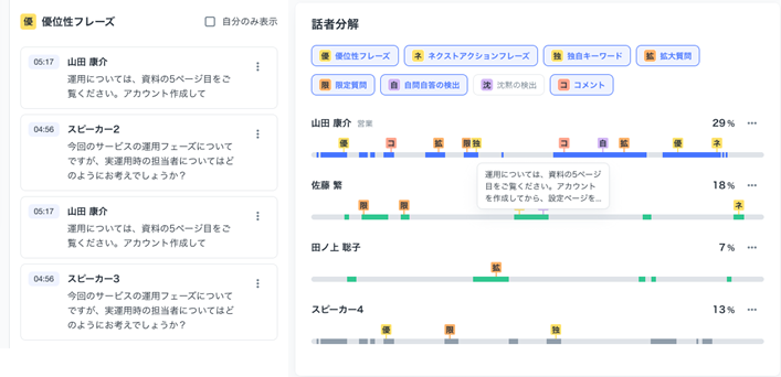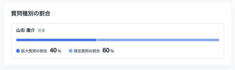 【3】「拡大質問」「限定質問」の割合を可視化。効果的なヒアリングの実施有無を確認できる。