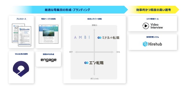 プレスリリースや特設ページ、『engage』を用いた採用HPの作成、Web広告での告知に加え、各求人サイトでの集客支援を実施。『エン転職』『AMBI』『ミドルの転職』とターゲットの異なる3つの求人サイトを活用することで、ターゲットへ網羅的に求人を届けました。ビデオ面接ツール『VideoInterview』、採用管理システム『Hirehub』の提供により、選考フローを支援。求職者と同社の適切なマッチングを実施しています。