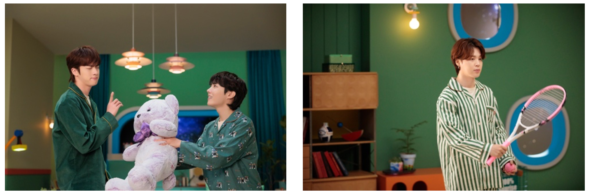 (左)JINに巨大なぬいぐるみを渡すシーン。「(この演技は)可愛かったはず」とJ-HOPEは自画自賛?