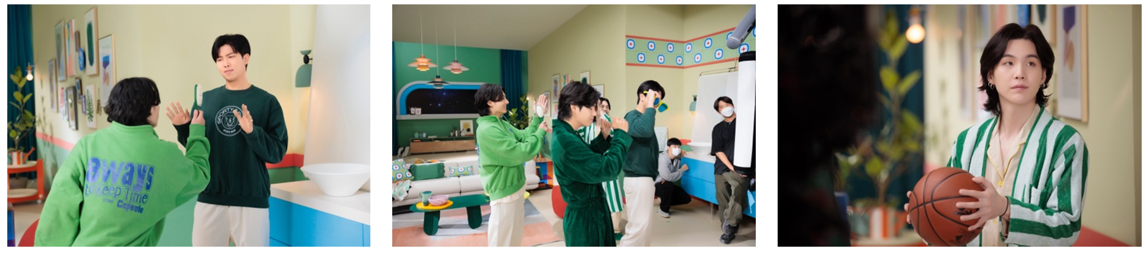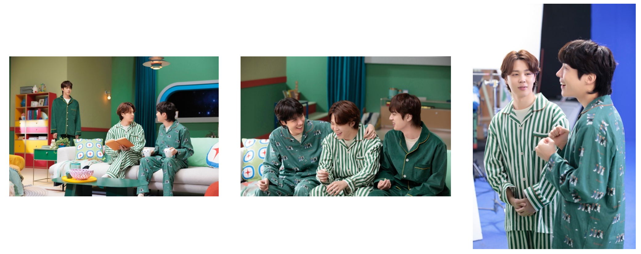(左)JINが「I’m so sleepy.」とやってきて、顔を見合わせるJIMINとJ-HOPE。J-HOPEは歯のオブジェがお気に入りの様子。