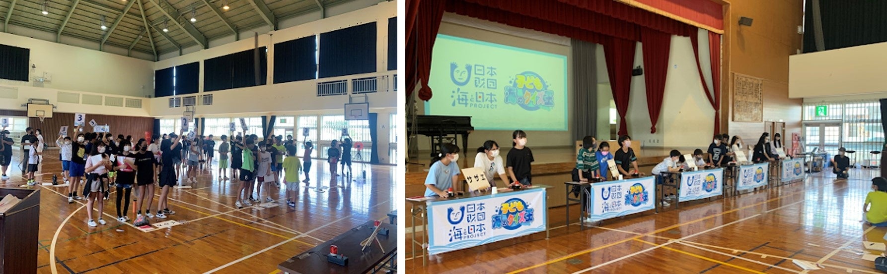 海を身近に感じられる問題が次々と繰り出されました。児童みなさんが集中してクイズを聞いて、わかったぞ!という瞬間の真摯な表情でボタンを押し、正解したときの喜びや、誤答だったときのくやしさが、体育館の熱気になって伝わります。