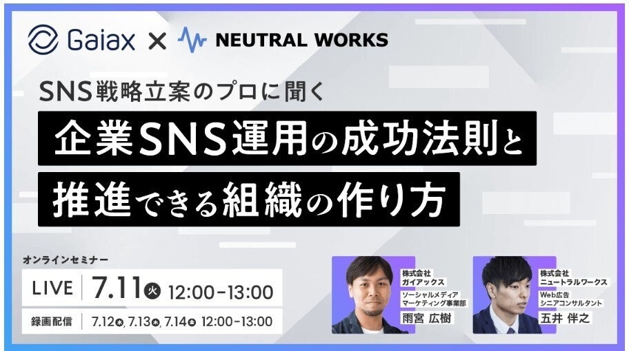 当ウェビナーでは、これからSNSを活用してビジネスの成長を加速させたいと考える企業ご担当者様に向け、SNS運用でおさえておくべき成功法則と、組織に根付かせるための具体的なプロセスについて解説をいたします。