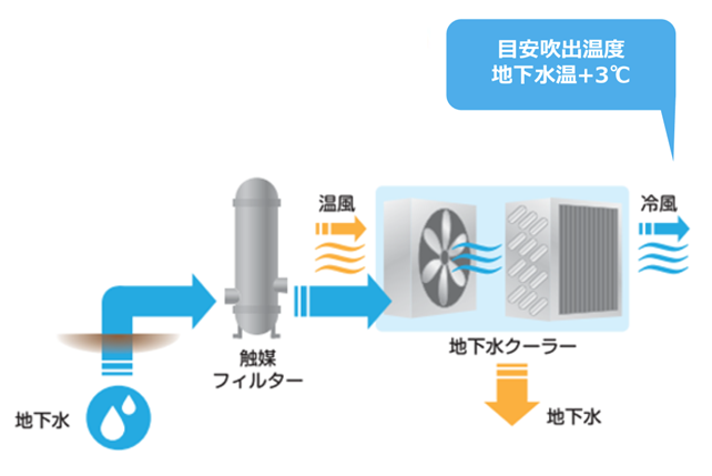 なお、自然の地下水を使うことで水質に不安を感じられる方もいらっしゃいますが、殺菌剤と触媒フィルタを使うことで水質が改善されるため、食品を扱う工場などでも安心して導入いただけます。