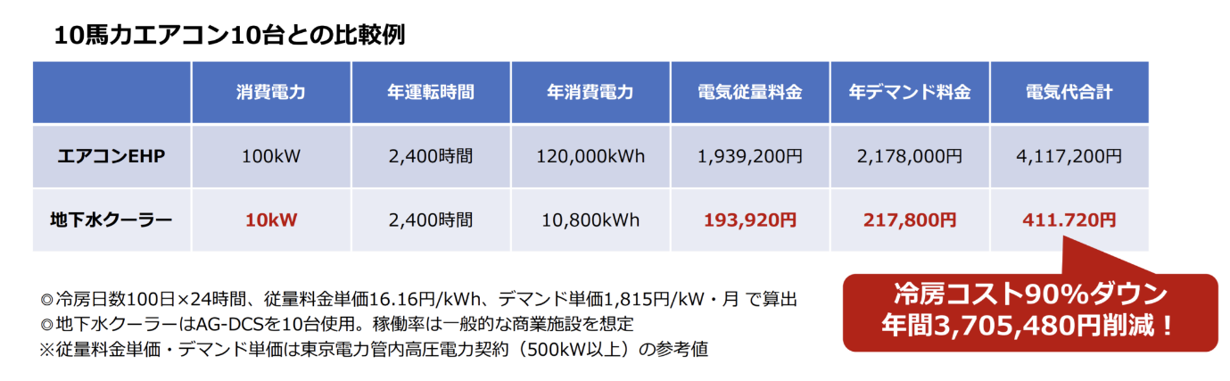 (図2:10馬力エアコン10台と地下水クーラーとの比較例)