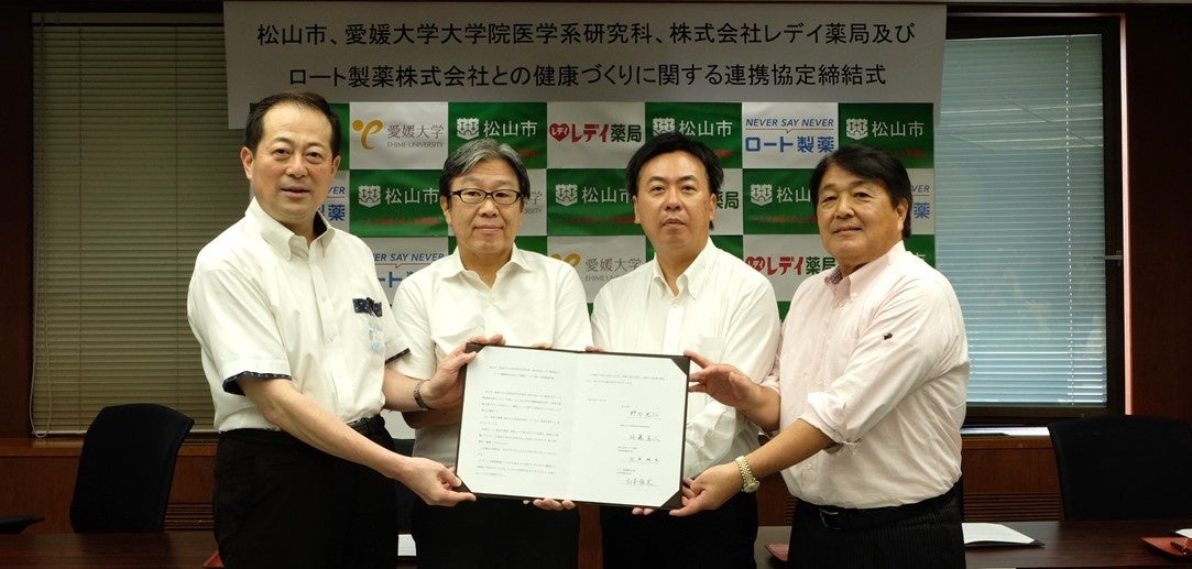 ロート製薬株式会社(本社:大阪市、社長:杉本雅史、以下当社)は、2023年7月4日、愛媛県松山市(市長:野志克仁)、愛媛大学大学院医学系研究科(科長:羽藤直人)、株式会社レデイ薬局(本社:愛媛県松山市、社長:白石明生)の4者で連携協定を締結いたしました。今回の協定締結により、松山市民のみなさまの健康づくりに貢献していきます。