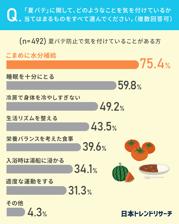 夏バテ防止策として「こまめに水分補給」が75.4%、「睡眠を十分にとる」が59.8%なのに対して、39.6%が「栄養バランスを考えている」でした。
