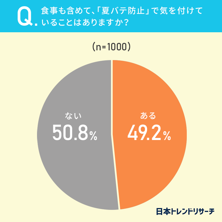 49.2%とほぼ半数の方が、食事も含めて、「夏バテ防止」で気を付けていることは「ある」と回答しました。