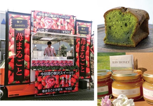 イチゴがまるごと入った贅沢なかき氷や、プロポリスや酵素がたっぷりのイスラエル産非加熱はちみつ、日本茶インストラクターが選りすぐった日本茶を使用したバターケーキを販売します。