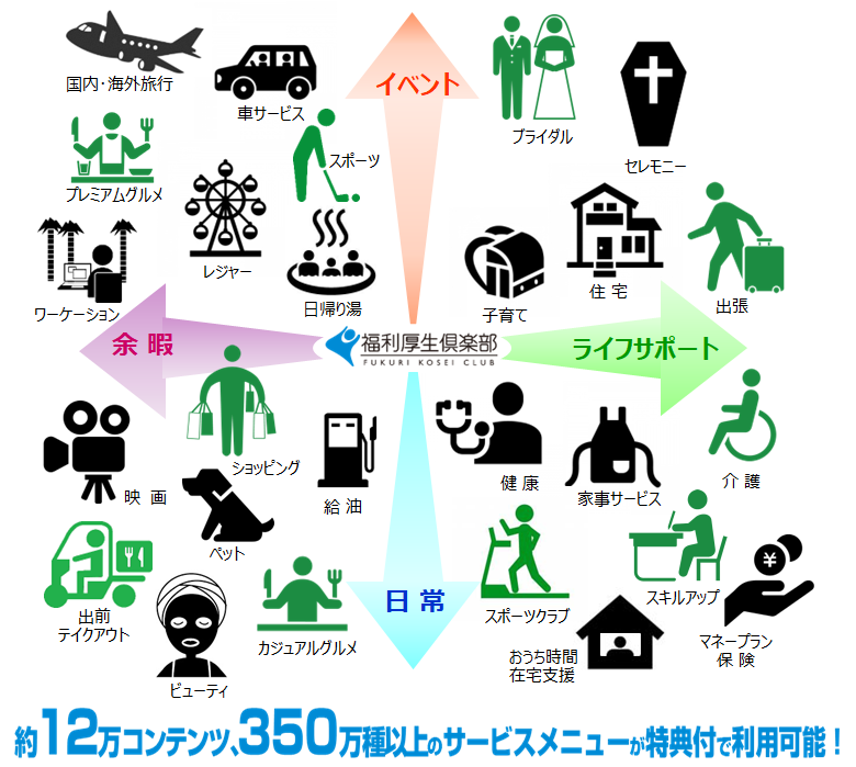 さらに、ヘルスケアサポート・スポーツジムなどへの利用強化はもちろんのこと、健康経営や女性活躍の推進支援など、様々な時代のニーズにお応えできるサービスをご用意。人事総務・労務担当者の業務負荷軽減を目指すとともに、従業員エンゲージメントの向上につながるソリューションをお届けいたします。