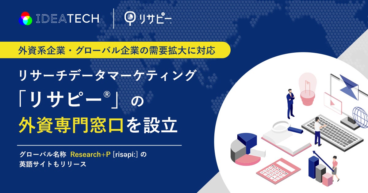 IDEATECHでは、企画立案から調査設計、プレスリリースの作成/配信、効果測定までを一貫してご提供するリサーチデータマーケティング「リサピー®︎」を、2020年4月開始当初から、累計300社以上にご導入いただき、1000件以上のマーケティング支援を行ってまいりました。日本国内に進出している外資系企業様・グローバル企業様においても、認知度向上やサービスの自社の立ち位置を明確化するためにご導入いただくケースもあり、マスメディアなどの取材獲得やYahoo!ニュースでの掲載を実現しました。その活動を通じ、クライアント様においては、海外本社での高い評価も得ることができました。今までは日本語での対応にとどまっておりましたが、今後さらにグローバルのニーズにお応えするため、英語での対応をサポートする外資専門窓口を開設いたしました。