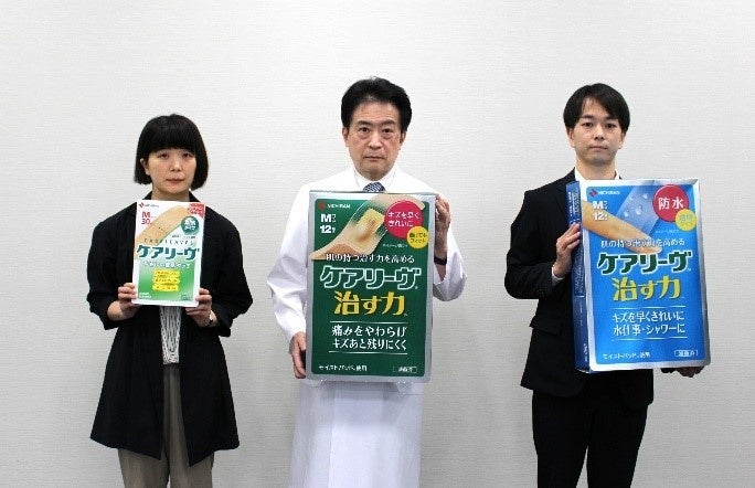 ニチバンでは、キズぐちが乾燥して、かさぶたができた状態ではモイストヒーリングで治すことが難しいため、「ケアリーヴ(TM)」などでキズの保護をおすすめして。ケアリーヴ(TM)は、 T字形で指先にしっかり巻ける指先用やひざなどの大きなキズにも対応できる超大います判など、ケガをした部位やキズの大きさに合わせて選べる豊富なサイズを用意しています。テープ部分が耐久性のある布素材で、力仕事や作業量の多いシーンでもはがれにくい「ケアリーヴ(TM)パワー&フィット」などもありますので、使用シーンに合わせてお選びいただければと思います。