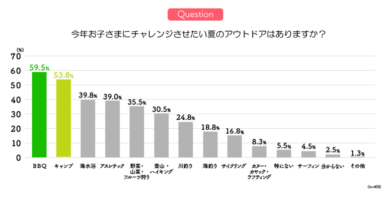 今年子どもにチャレンジさせたいアウトドアのジャンルの上位は、1位が「バーベキュー(BBQ)」(59.5%)、2位「キャンプ」(53.8%)、3位が「海水浴」(39.8%)となりました。