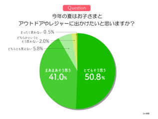 今年の夏に子どもとアウトドアやレジャーに出かけたいかと思う質問に、「とてもそう思う」が50.8%と、過半数を占める結果となりました。「まあまあそう思う」(41.0%)との合計は91.8%で、この夏は親子でのアウトドアやレジャーに対する意欲が非常に高いことがわかりました。