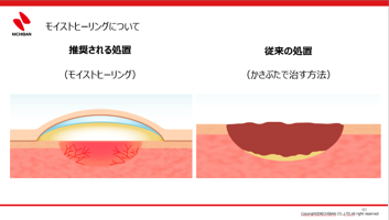 「モイストヒーリング」とは、患部を湿ったまま密封し、キズぐちから出てくる体液でキズを治す方法です。