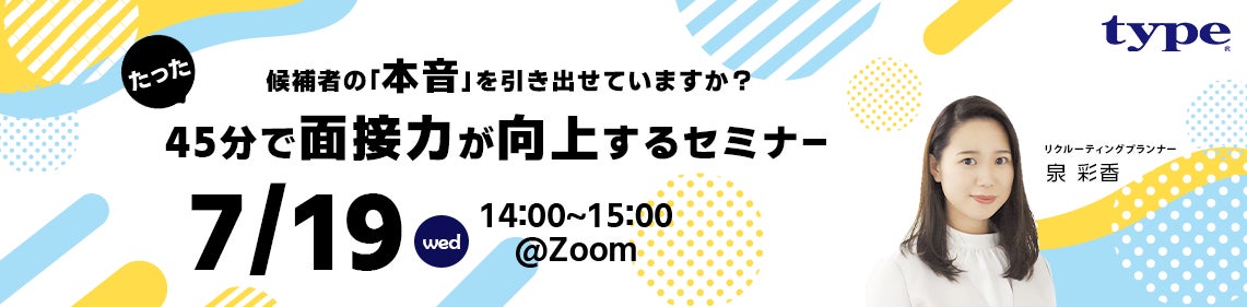 転職サイト「type」では、7/19(水)14時より「候補者の「本音」を引き出せていますか?【45分で面接力が向上するセミナー】」を開催いたします。