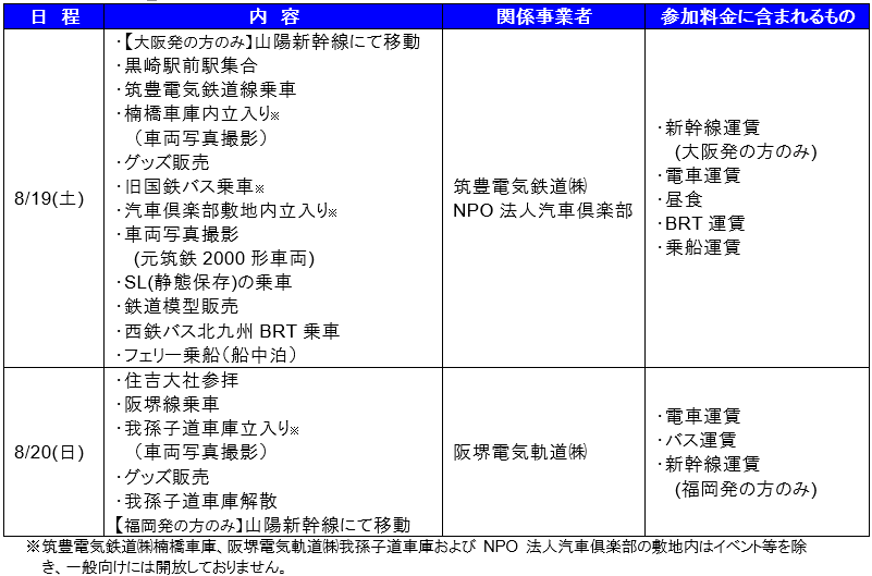 ツアー代金は、大人39,800円(税込)、小学生以下34,800円(税込)で、西鉄旅行㈱のホームページにて7月4日(火)より予約受付を開始いたします。九州・関西それぞれの鉄道ファンの皆さまのご参加を心よりお待ちしております。