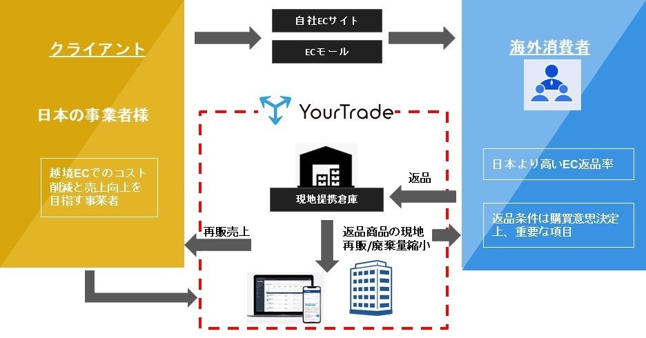 昨今急成長する越境ECにおいては、海外で返品を受け付けた場合、日本に戻す輸送費が負担になることから、現地で廃棄するケースが多く、コストや環境面で課題となっております。