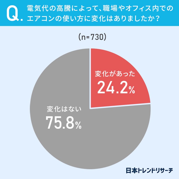 24.2%の方が、電気代の高騰によって、職場やオフィス内でのエアコンの使い方に変化を感じているようです。