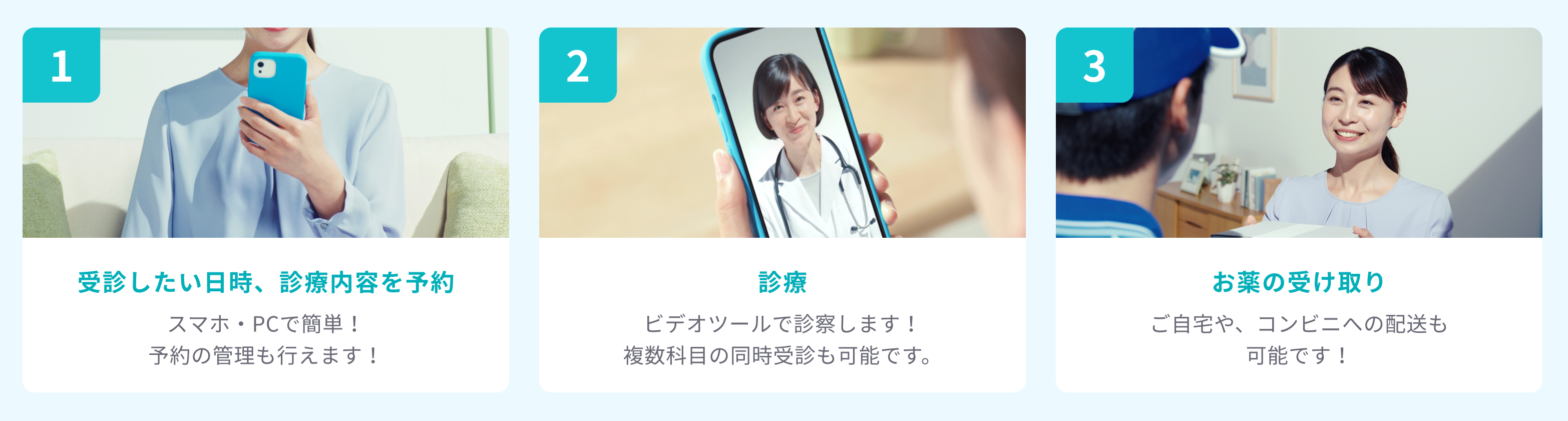 従業員の方はDMMオンラインクリニックのウェブサイトで予約から問診、診察を受けることができ、処方薬はご自宅や外出先、コンビニエンスストアなどでお受け取りいただけます。