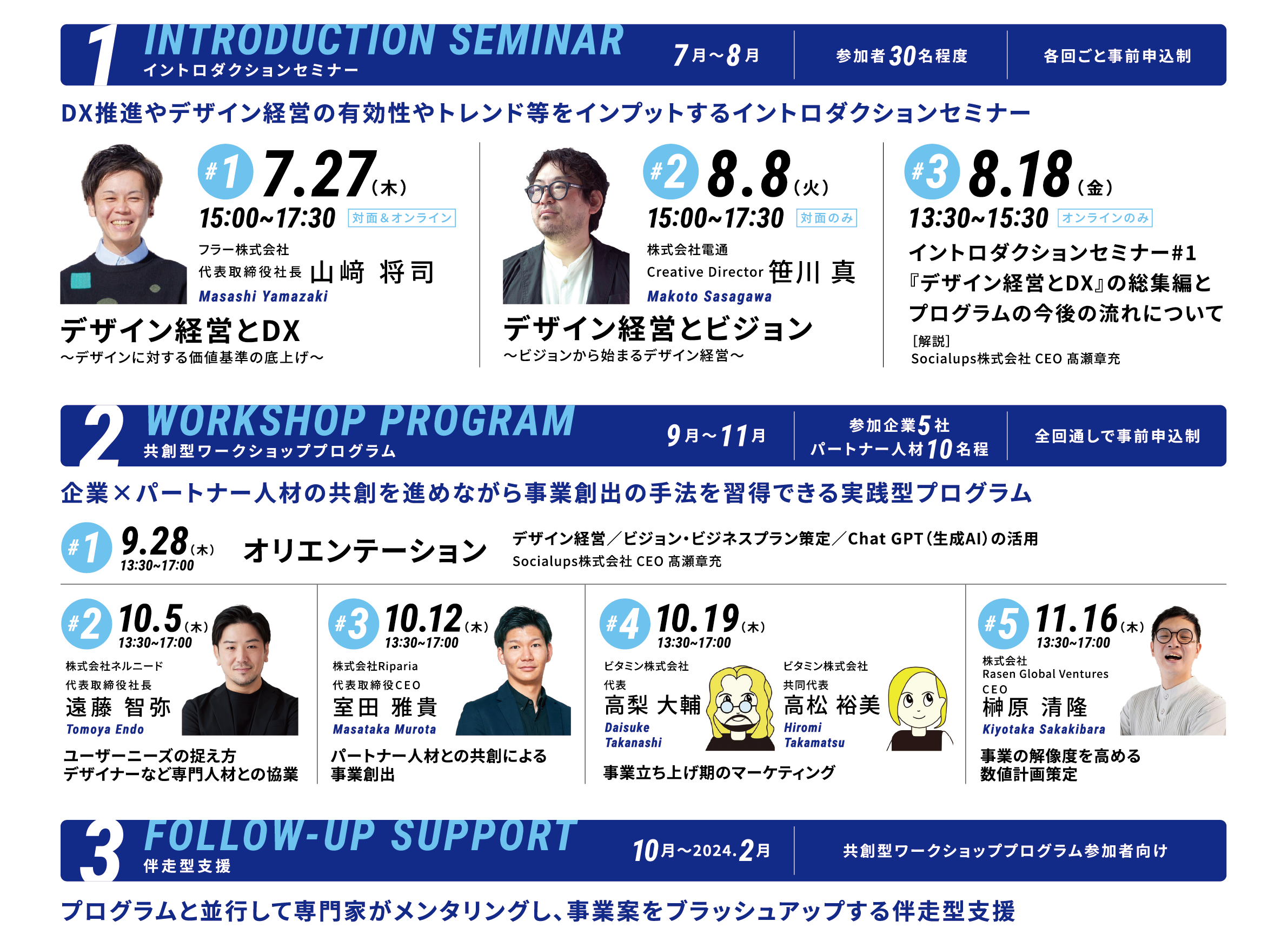 2023年7月から2024年2月までの約7か月の間、充実した講師陣によるセミナー、ワークショッププログラム、伴走型支援を実施し、新しい商品やサービスのローンチに繋げて行くことをゴールとします。各セミナー及びプログラムの参加費は無料です。