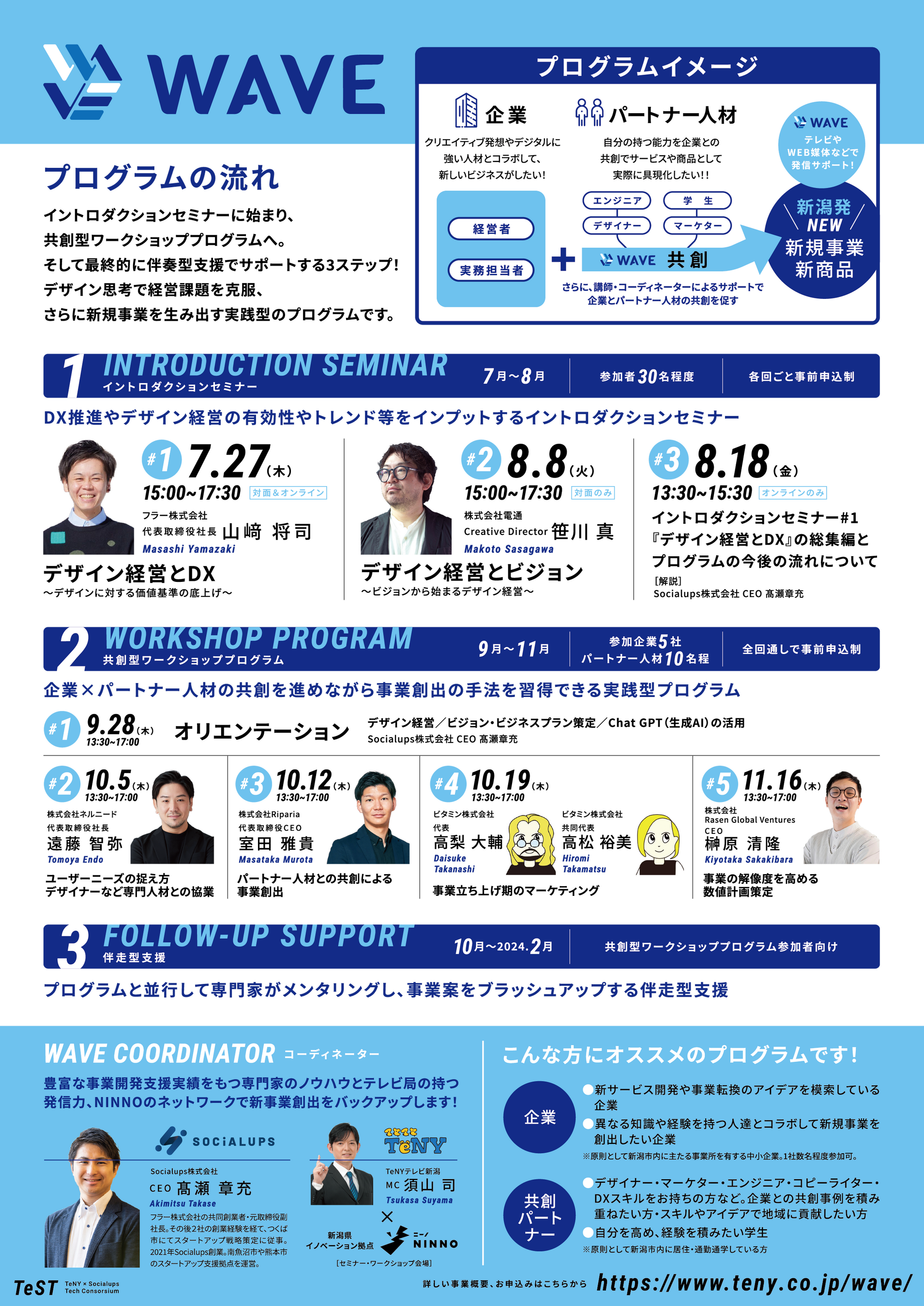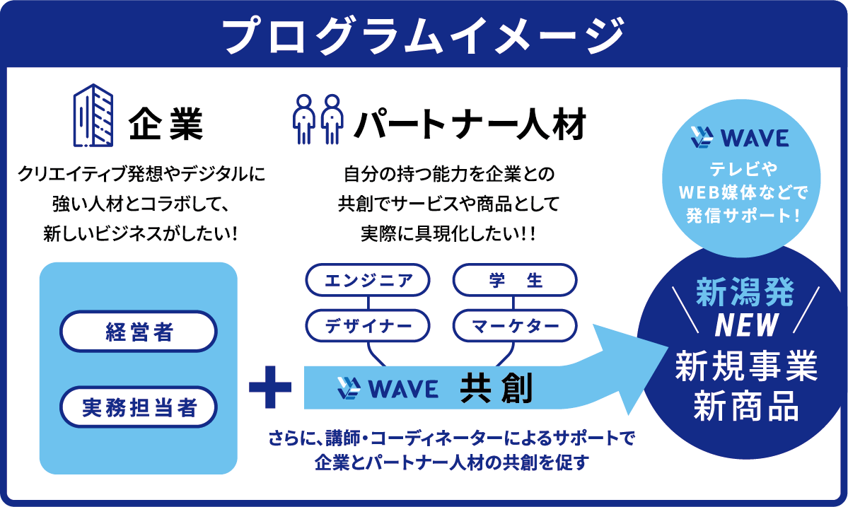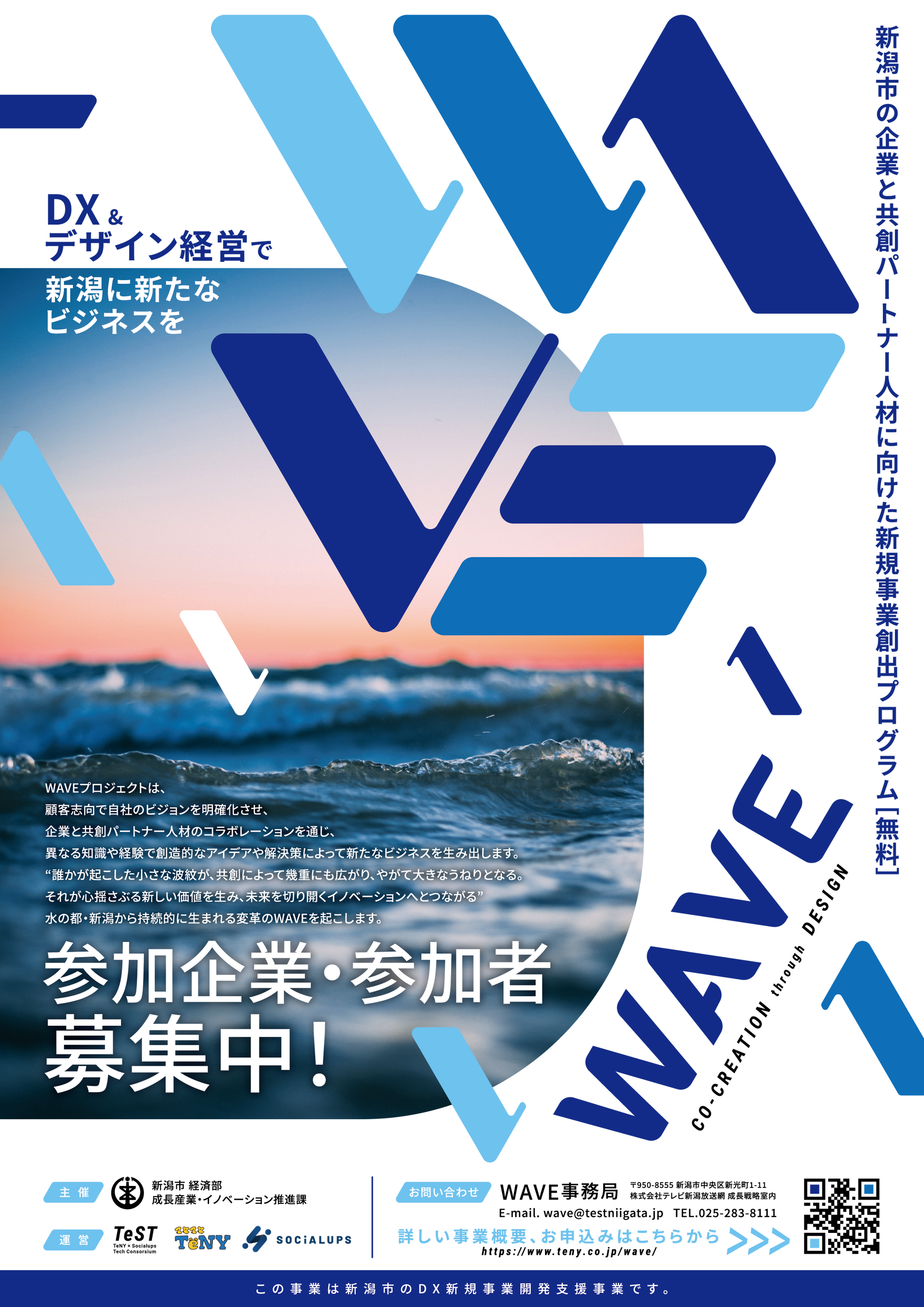 今回、本社を構えます新潟市様、株式会社テレビ新潟放送網様と主に、新潟市の企業の皆様の新規事業創出プログラム“WAVE”を運営できますことを大変光栄に存じます。