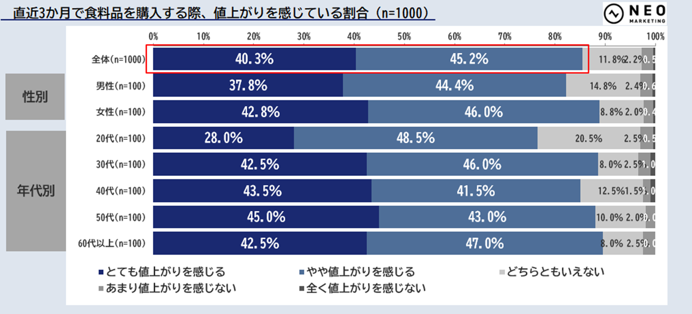 直近3か月で食料品を購入する際、値上がりを感じているかについてお聞きしました。全体を見ると、「とても値上がりを感じる」「やや値上がりを感じる」と回答した方は85.5%と非常に高い結果となりました。