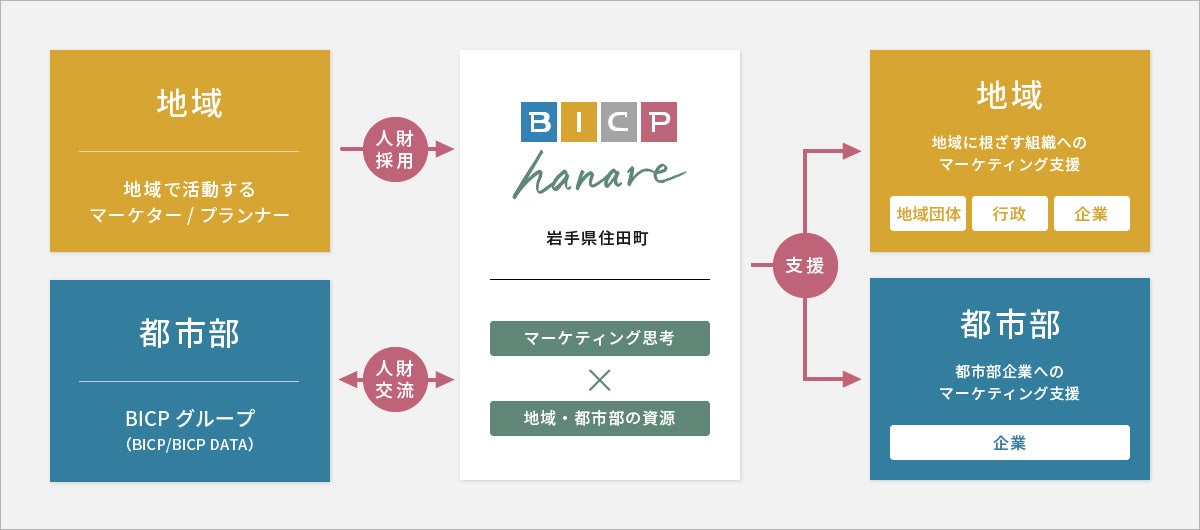 新会社ビーアイシーピー・ハナレは、「マーケティングの力で、地域をもっと豊かに。」というビジョンを掲げマーケティング思考を地域の中にインストールすることで、地域が自らの価値を発見し、提案をおこない、もっと豊かになるために、地域と共に走ってまいります。そのためにも都市部との資源の交換を重視し、「地域と都市の文脈を丁寧につなぐ」というミッションを掲げ、都市部との連携を持ちつつ地域の中で自らプレーヤーとして活動しながら、地域企業、行政、団体を支援してまいります。