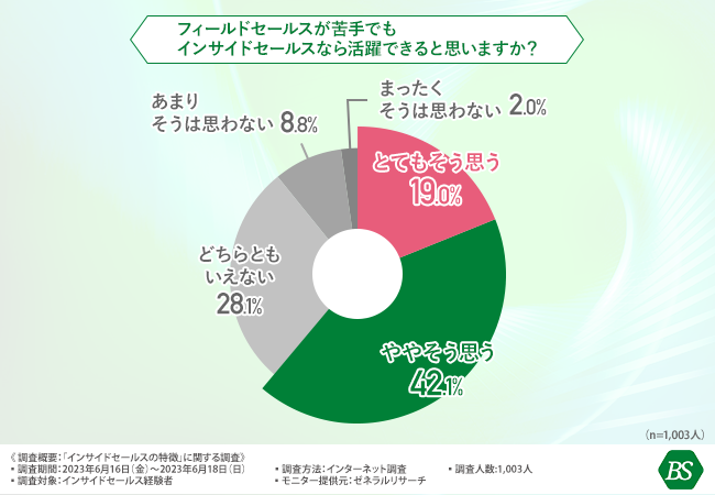 「フィールドセールスが苦手でもインサイドセールスなら活躍できると思いますか?」と質問したところ、『とてもそう思う(19.0%)』『ややそう思う(42.1%)』と6割以上の方が、フィールドセールスが苦手でもインサイドセールスなら活躍できると思っていることが明らかになりました。