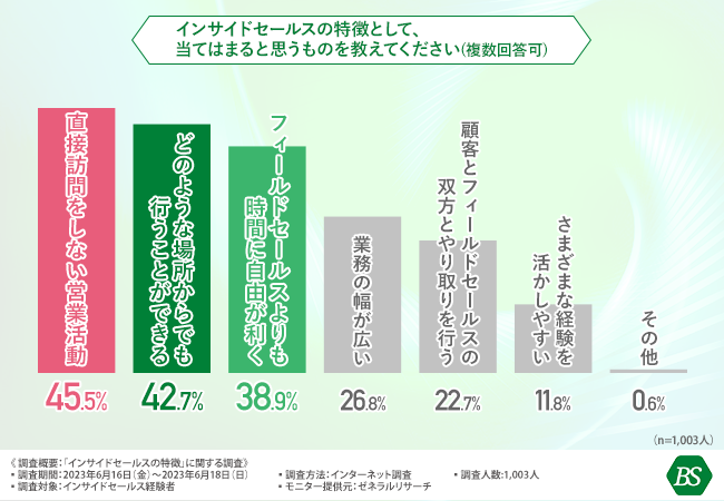 そこで今回、インサイドセールス(内勤営業)専門の人材紹介(https://peraichi.com/landing_pages/view/jinzaitensyoku/)を行っている合同会社ブライトシーン(https://www.brightscene.org/)は、インサイドセールス経験者を対象に、「インサイドセールスの特徴」に関する調査を実施しました。