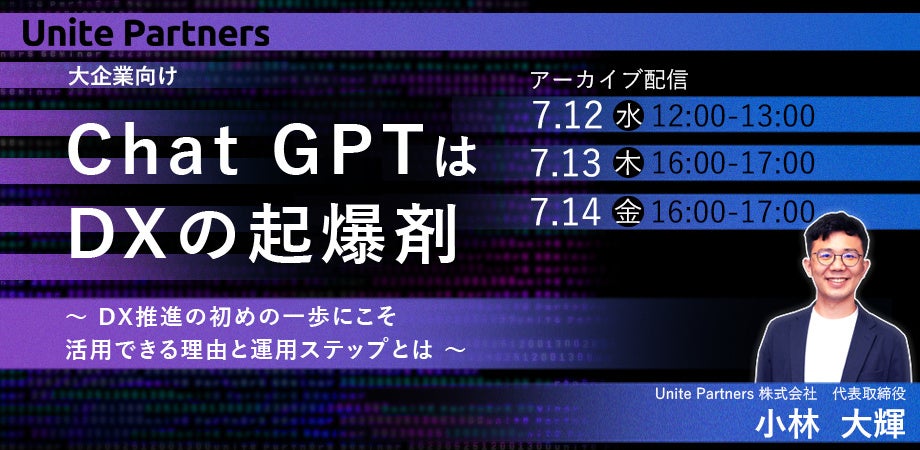 企業の変革パートナーを目指すブティック型コンサルティングファームのUnite Partners株式会社(本社:東京都、代表取締役:小林大輝)は、2023年7月12日(水), 13日(木), 14日(金)に、「ChatGPTはDXの起爆剤〜 DX推進の初めの一歩にこそ活用できる理由と運用ステップとは 〜」と題して大企業のDX担当者向けのセミナーを開催します。