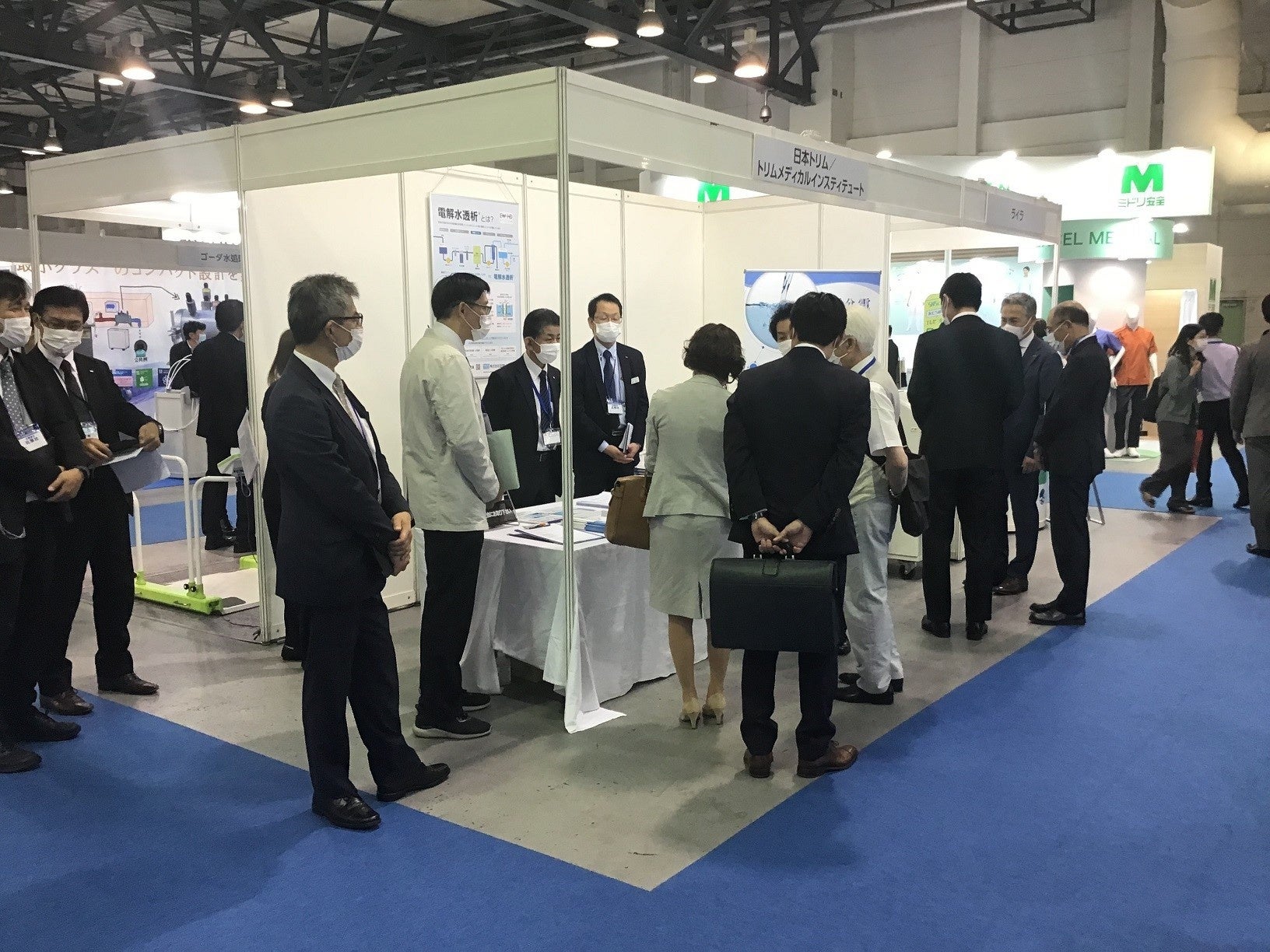 期間中に出展したブースでは、電解水透析の仕組みなどに関するパネル展示とともに、ブースを訪れた方へパンフレットをお渡ししながら説明を行いました。既存装置の入替えや病院の新設・移転を考えている関係者の他、新しく透析治療を始める医療従事者などが訪れました。来訪者からは、「最近、電解水透析という言葉をよく耳にするようになったけど、通常の透析と比べて何が違うの?」などの質問が多くありました。