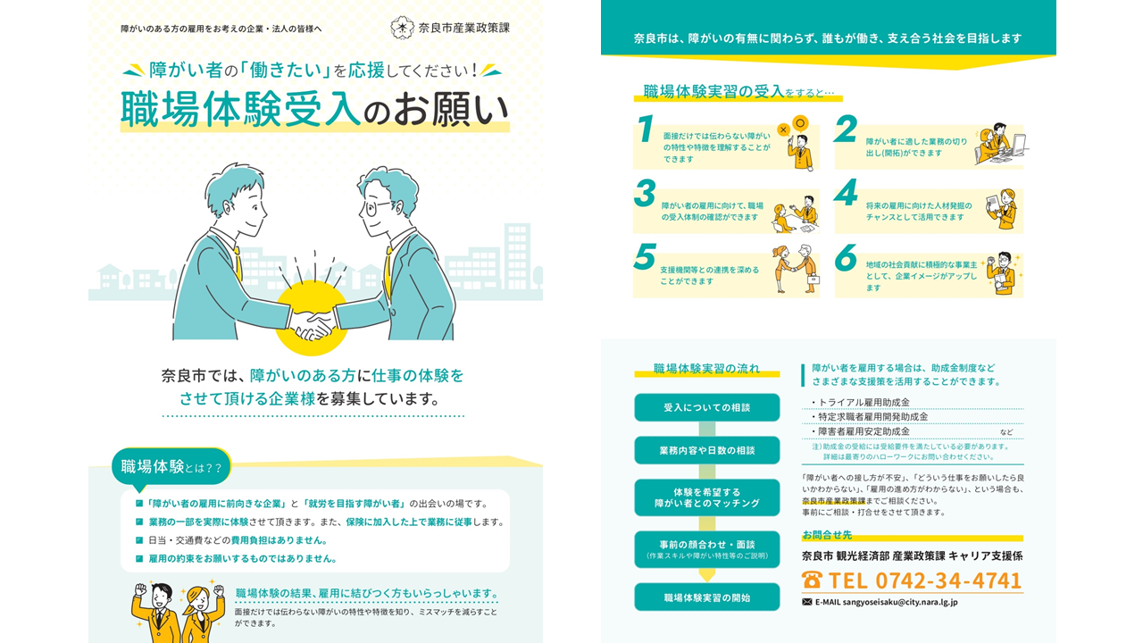 奈良市は、障害者が本人の能力や適性に応じた職業に就き、自立した生活ができるよう、その働く機会や職域の拡大を目指し、市内企業との職場体験実習(※)のマッチングに取り組んでまいりました。