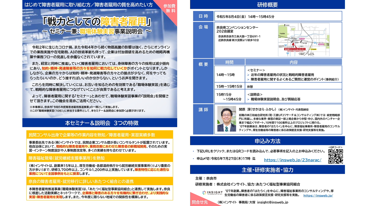 本事業は、市の「令和5年度障害者雇用推進事業」(委託先:株式会社インサイト)のスタートアップセミナーとして開催します。障害者雇用に初めて取り組む企業から、更に質を高めた障害者雇用をしたい企業まで幅広い目的に対応したセミナーやイベントを今後も開催します。