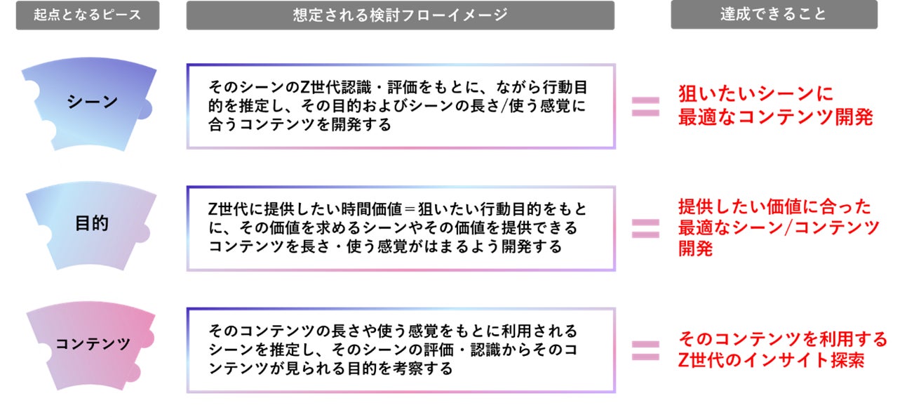 この「ドーナツパズルモデル」は1つのピースを起点にした際の最適な体験設計を検討する際に活用でき、「あるシーンにおける最適なコンテンツ設計」や「Z世代の行動目的に寄り添ったシーン開発/コンテンツ開発」など対Z世代の体験設計の道標になると考えています。