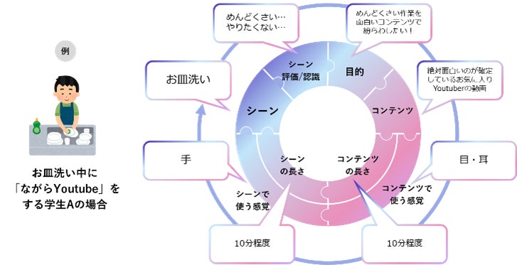 このモデルは、“ながら行動”を行う際に「シーン/目的/コンテンツ」の3要素を上記のようなドーナツ型のパズルがはまるように無意識的に決定しているという、Z世代特有の”ながら行動”様式を構造的に示したものです。