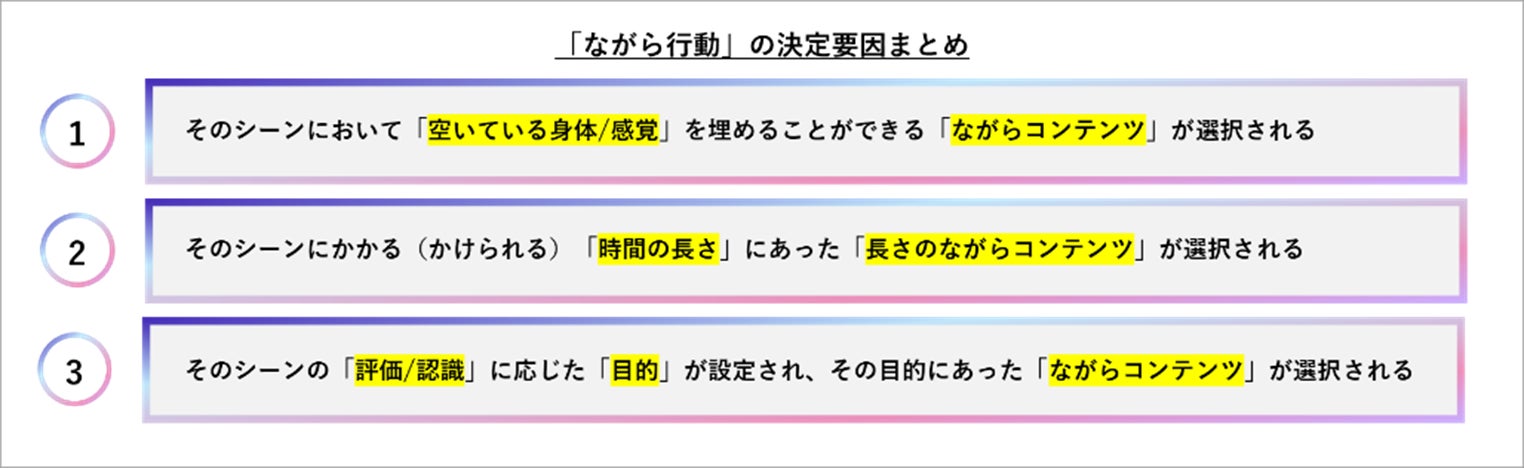 その結果、Z世代の”ながら行動”が行われる背景には、「シーン」「コンテンツ」「目的」という3要素に基づく以下の決定要因があることが明らかになりました。
