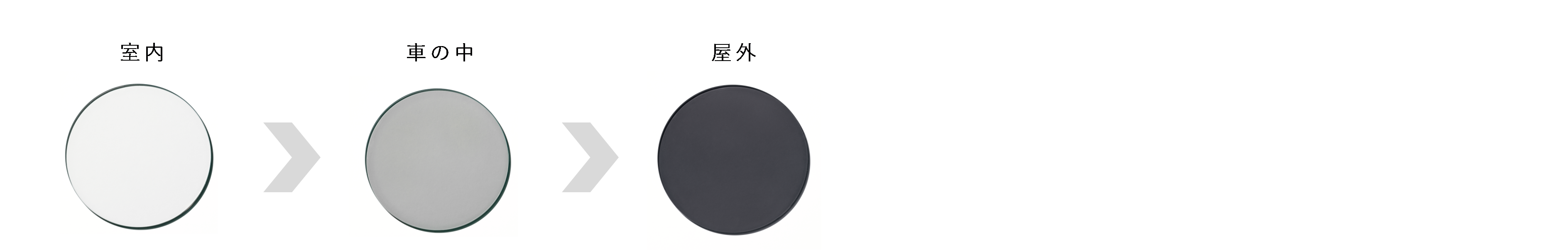 ※装用環境(気温・天候・紫外線量・太陽光とレンズの角度)の条件の違いによって、濃度変化および色調変化が異なります。